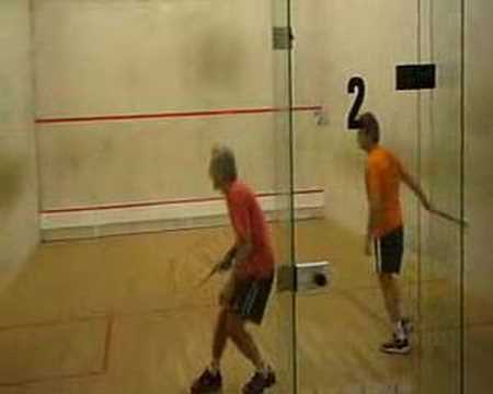 Stewart Boswell punishes an amateur onthe squash court (part 2) - Who Invented Squash - Middle-aged man takes on top pro and pays the price (2nd game). Boswell is a very good sport...